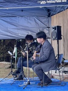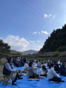 田んぼアリーナは、ブルーシートの50枚近くの座布団を並べて、紅白幕も目出たく『どんまいぜんまい』の歌声が山間の谷間に響きました。